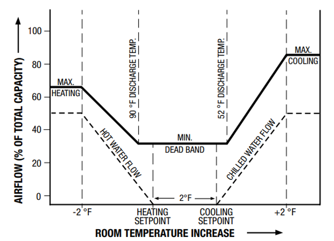I want to highlight a few differences enabled by the higher capacity and better fans on with these units vs. the in-room designs. The ability to pair a modulating valve with a modulating fan allows the unit to meet the specific needs of the space. The fan speed is controlled by the thermostat in the space and the valve setting is controlled by the leaving air temperature. The unit finds the exact amount of cooling/heating and maintains comfort at the right fan speed and valve setting. This increases the efficiency and reduces sound from the unit.