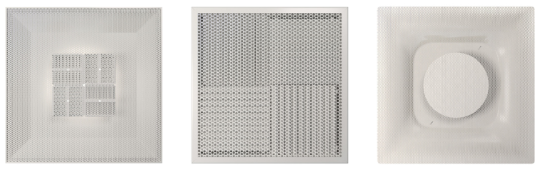 Besides the UNIs, perforated diffusers are another good square diffuser option for architectural ceilings. Because the supply and return models both feature a perforated face, they can be integrated into the ceiling grid to create a flushed, flat appearance. These models (4310, 4320, 4330, 4340, and 4350 series) also offer a range of throw pattern options, from circular or square patterns to modular controllers.