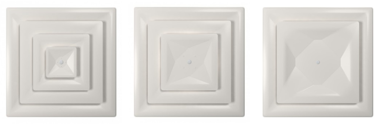 designed around providing maximum performance with high airflows. These diffusers feature angled vanes instead of cones, which affords less obstruction to the supply air. These vanes generate longer throw distances and result in a cross-shaped throw pattern in the basic 4-way configuration. They are highly customizable and come in a wide array of vane and throw pattern arrangements.